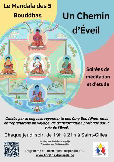 les soirées d'étude se composent d'une méditation de 30 minutes au choix, d'un enseignement et d'un espace de questions/réponses et de parole.